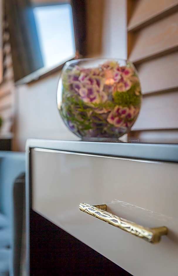 This suite features sleek wooden floors and louvered oak panels. There is a spacious lounge area with a sofa bed, bathroom with walk-in shower and separate bathtub, double sinks and additional luxury bathroom amenities. Extras include a Nespresso machine, 48-inch LED TV with premium channels, including sports, plus an iHome Bluetooth docking station.